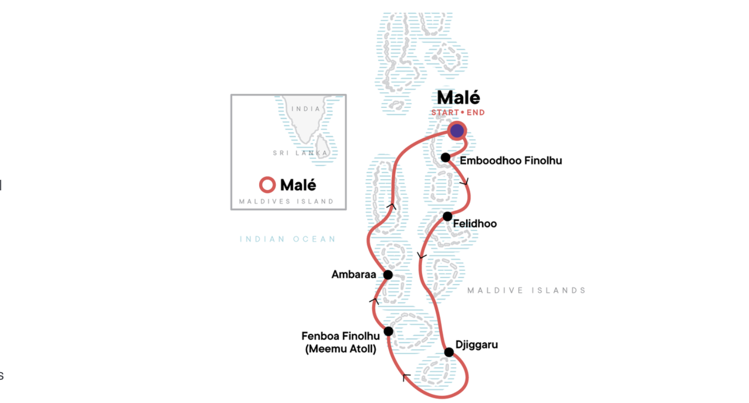 Notes supplémentaires : Veuillez noter que l'excursion incluse "plongée avec tuba aux Maldives" commence vers 10h30. Nous recommandons donc vivement aux voyageurs d'arriver avant 10h00 afin d'avoir suffisamment de temps pour se rendre au bateau pour cette activité. Tout vol arrivant après 10h00 entraînerait la perte de cette excursion incluse. MAIS n'ayez crainte, il y a de nombreuses possibilités de plongée avec masque et tuba tout au long du voyage. Veillez simplement à arriver avant 14h00, afin de ne pas manquer le dernier transfert vers le bateau.